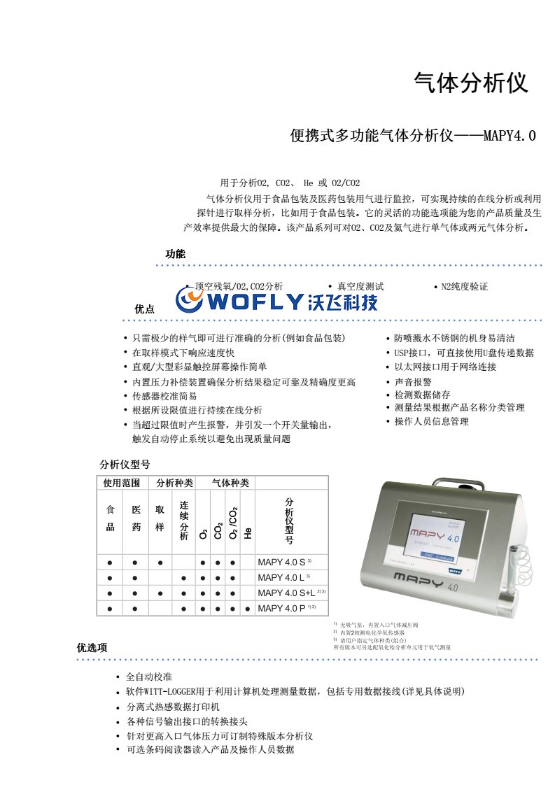 全自動校準軟件WITT-LOGGER用于利用計算機處理測量數據,包括專用數據接線(詳見具體說明)分離式熱感數據打印機各種信號輸出接口的轉換接頭針對更高入口氣體壓力可訂制特殊版本分析儀便攜式多功能氣體分析儀——MAPY4.0
