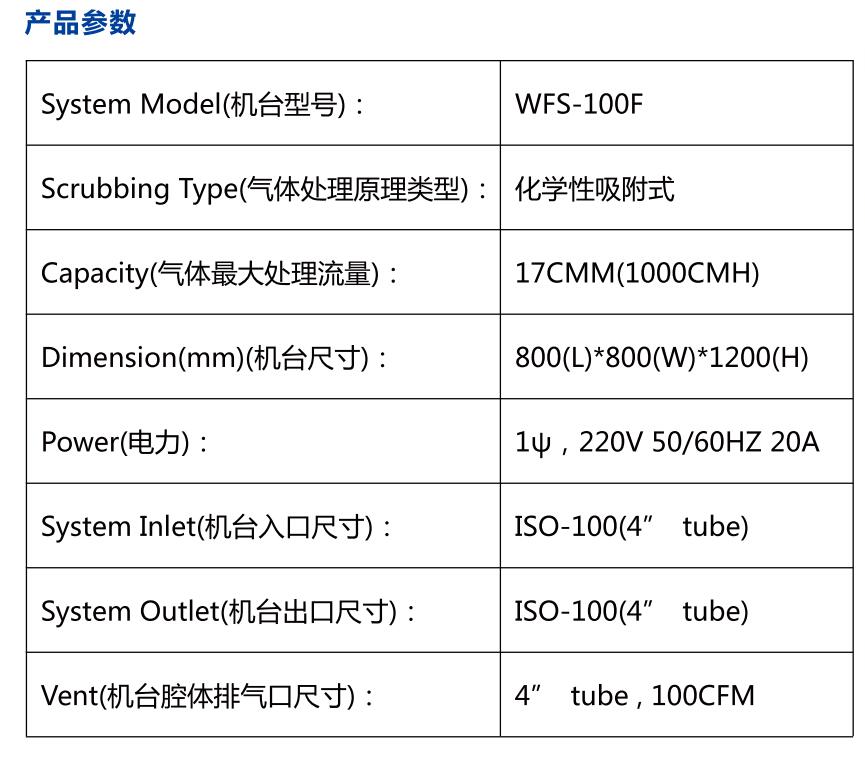 WFS-100F吸附式local scrubber 尾氣處理設備可處理氣體種類包括半導體、液晶以及太陽能等行業中蝕刻制程與化學氣相沉積制程中使用的特氣,主要包括SiH4、SiH2Cl2、PH3、B2H6、TEOS、H2、CO、NF3、SF6、C2F6、WF6、NH3、N2O等。